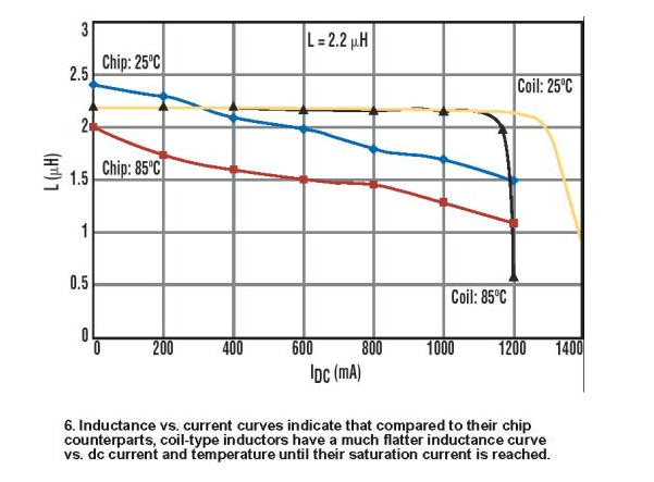 从图6可看到,一般来说,线圈式电感的电感-直流电流及温度关系曲线在饱和电流之前很平坦。在饱和电流之后,则随电流变化出现急剧下降。典型地,ISAT在85℃时比25℃时要低10%到20%。